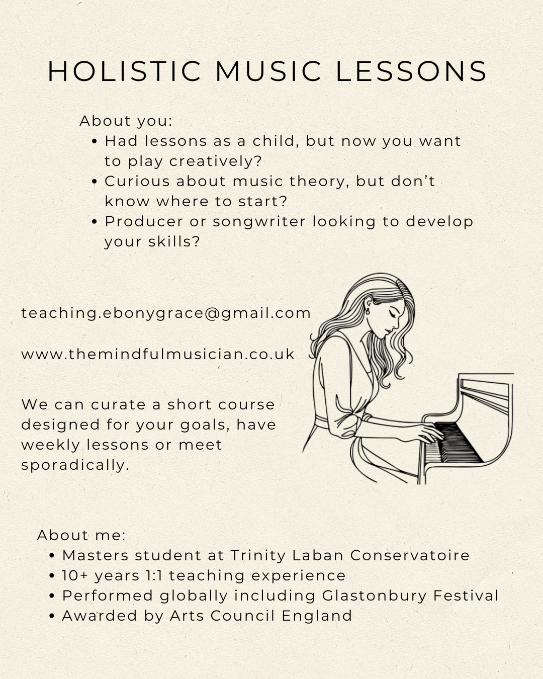 Hi there, I’m Ebony — a full-time musician and music educator. I perform solo as well as with bands, and have appeared at Glastonbury Festival, The Great Escape, Radio1, Radio6 and more.